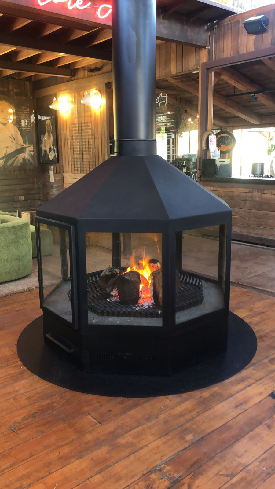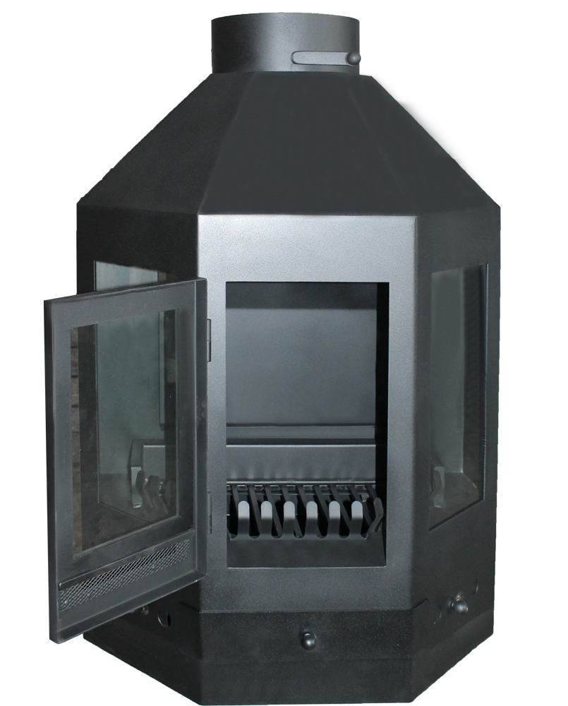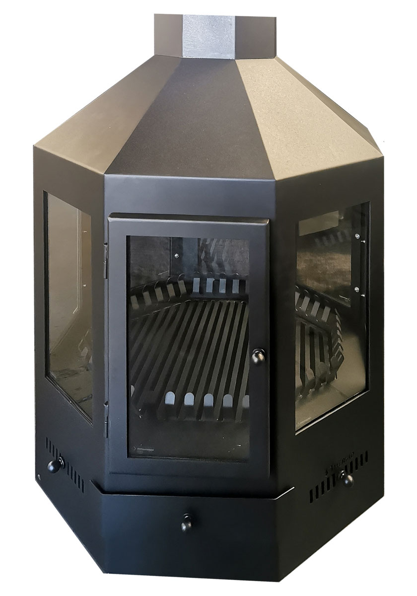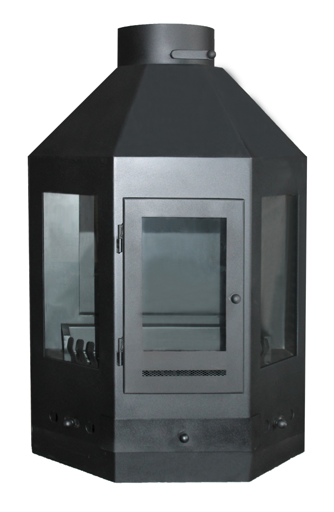 The Octagon Fireplace is an 8-sided unit with glass panels on 7 sides and a glass door on the 8th. Perfect as a room divider, the flames can be viewed from 360 degrees, radiating heat in as much degrees.